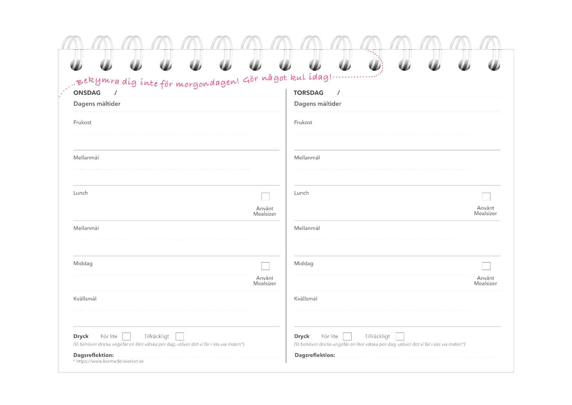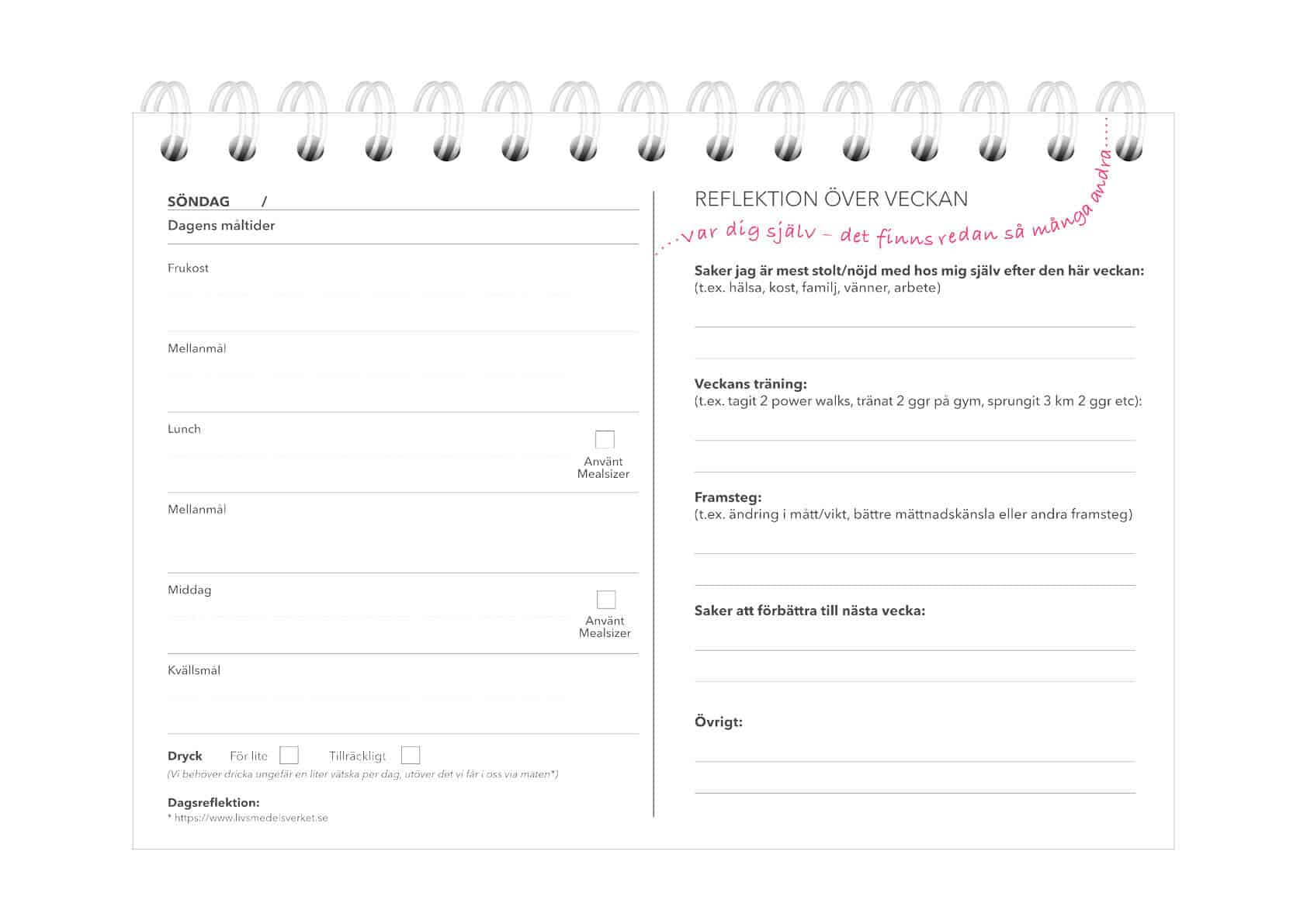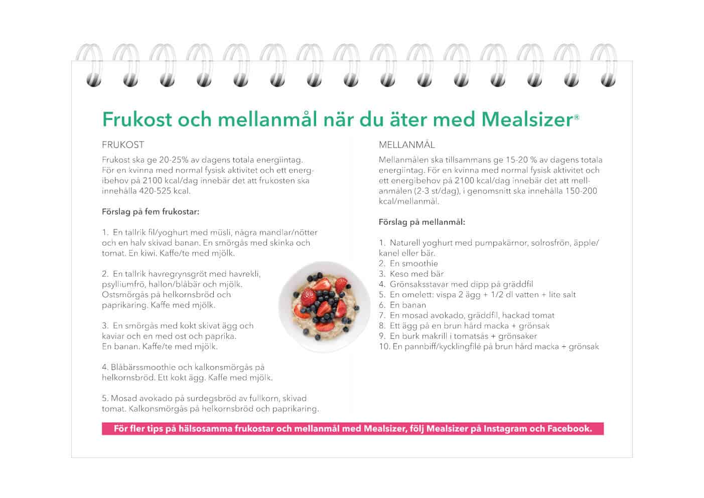 Att skapa en medvetenhet om vad du äter är första steget till ett hälsosammare liv med hjälp av Mealsizer®. Med hjälp av denna dagbok tillsammans med ditt Mealsizer måltidsmått kan du få en bättre förståelse för t.ex. vilken mat som är bra för just dig, hur ofta du behöver äta för att hålla energinivåerna så du inte blir sugen mellan måltiderna etc. Dagboken varar i 13 veckor, dvs. ett kvartal.